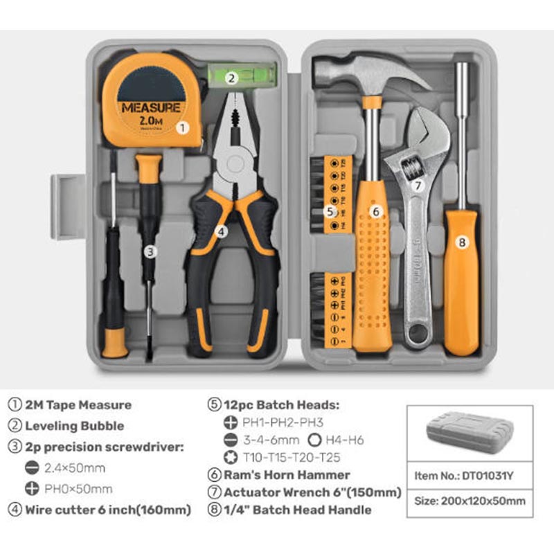 MARSHINE 20 ピース手動油圧ハードウェア ツール セットには、電子機器やおもちゃの小さな留め具に取り組むことができる 2 つの専用の精密ドライバーが含まれており、160 mm ワイヤー カッターは銅線やプラスチックでコーティングされたワイヤーをきれいに切ることができます。また、ツールセットには、正確な長さをチェックするための 2.0M 巻尺、真っすぐに取り付けるための水準器、ナット用の 150 mm アクチュエーター レンチ、軽いたたきや釘の作業に使用するラムズ ホーン ハンマーも備えています。